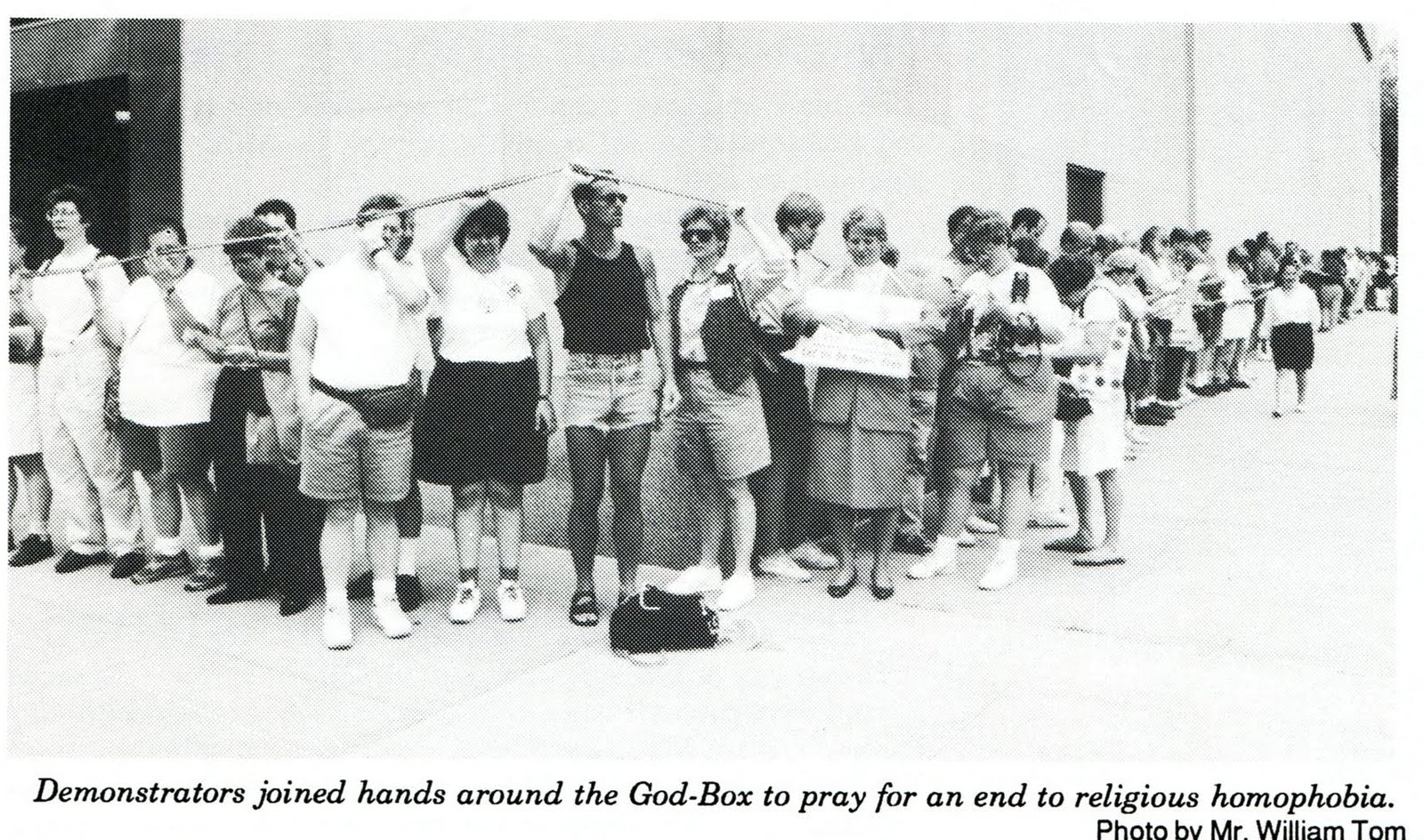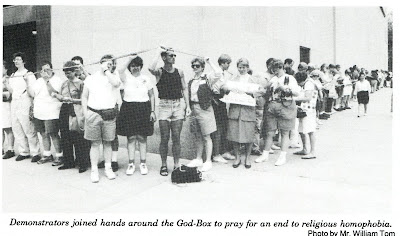 Hands Around the God Box was coordinated by myself (Kittredge Cherry) as MCC national ecumenical officer and Kim Byham of Integrity. It was held as part of Stonewall 25, celebrating on the 25th anniversary of the Stonewall Rebellion that launched the LGBT liberation movement.