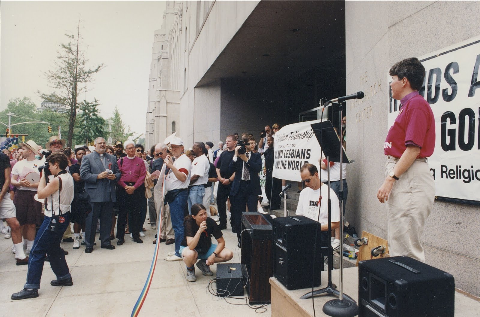 Kittredge Cherry speaks at Hands Around the God-Box, a prayer demonstration to end homophobia in the church. A rainbow ribbon stretches across the stage. MCC founder Troy Perry is clearly visible in a dark suit at the front of the crowd. Standing next to him is Otis Charles, Episcopal bishop who came out as gay in 1993.