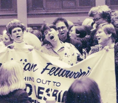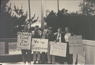 Nancy and I sang and held a banner at a demonstration for LGBT rights at the Christian feminist “Re-Imagining” conference Nov. 4-7, 1993 in Minneapolis. Our banner says, “A Christian fellowship reaching out to gays and lesbians around the world” with the logo for Metropolitan Community Churches.