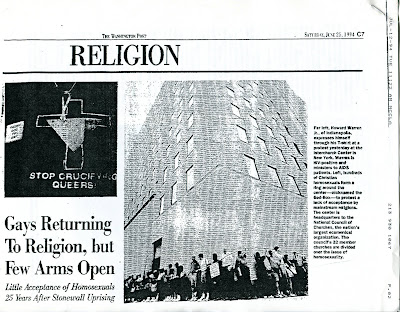 I organized Hands Around the God-Box, a prayer demonstration to end homophobia in the church at the National Council of Churches headquarters in New York City in 1994 on the 25th anniversary of the Stonewall uprising.