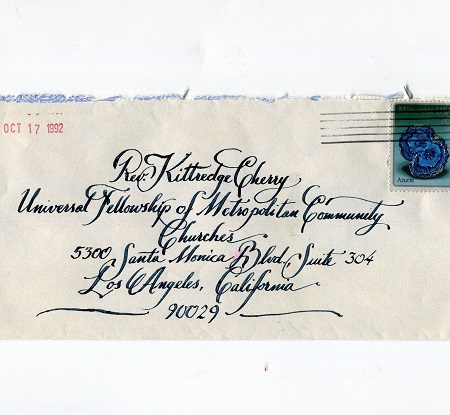 Over the years I have kept and treasured the elegant envelope addressed to me at MCC headquarters in John’s own handwriting. It is dated Oct. 17, 1992, when we were planning for the NCC meeting. This graceful calligraphy reflects a beautiful spirit who helped lay the foundation for LGBT people of faith today.