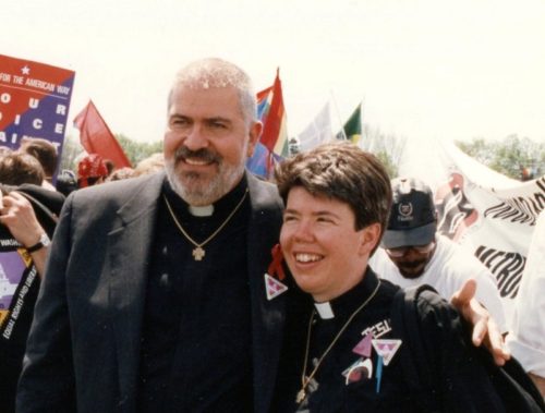 On the Sunday morning of the march, MCC sponsored a worship service on the steps of the Lincoln Memorial. We felt tremendous pride as we set up the podium and other equipment in that historic location. Someone there snapped the now-classic photo of Troy with his arm around me, both of us wearing clergy collars, MCC crosses and gay pink triangles, while the crowd behind us waved rainbow flags, protest signs and MCC banners.